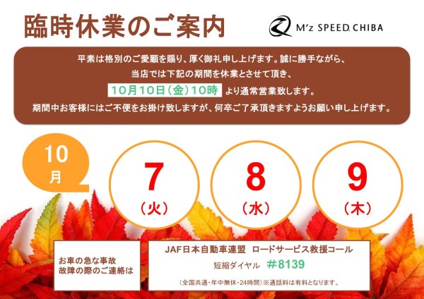 休業中の故障などの緊急時にはJAF(お電話番号#8139)またはご加入頂いております自動車保険のロードサービスまでご連絡をお願い致します。期間中お客様にはご不便をお掛けいたしますが、何卒ご了承いただけます様お願い申し上げます。