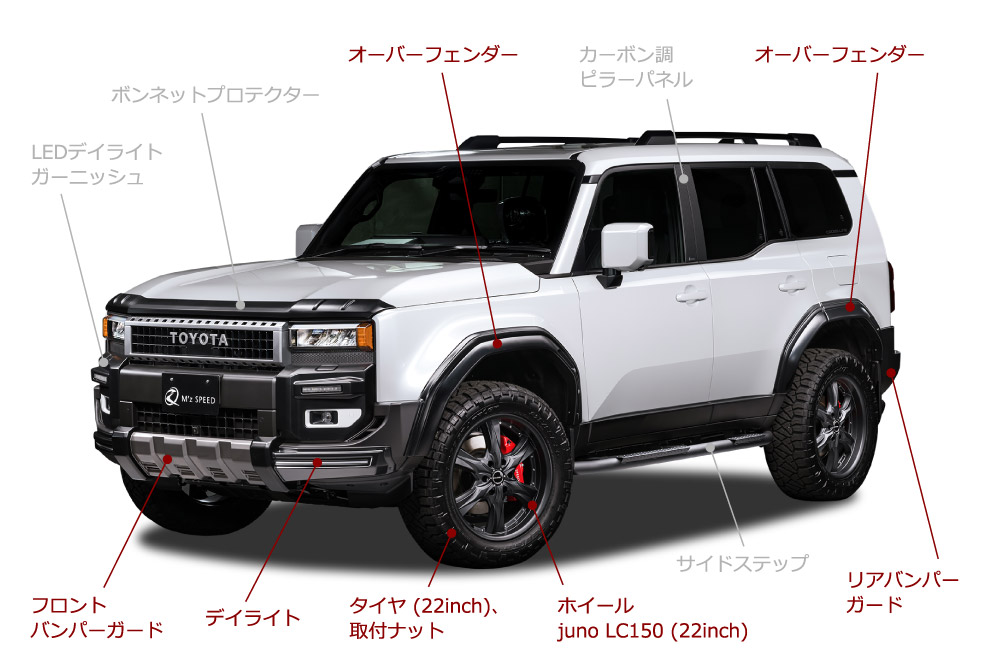 エアロバージョンと比較して下記装備がお得 CROSS-LINE サイドステップ(ブラック) AES製オーバーフェンダー AES製ボンネットプロテクター AES製カーボン調ピラーパネル ZEUS4本出しマフラー ステンレステール juno LC150 22インチ 22インチタイヤ(285/45-22)